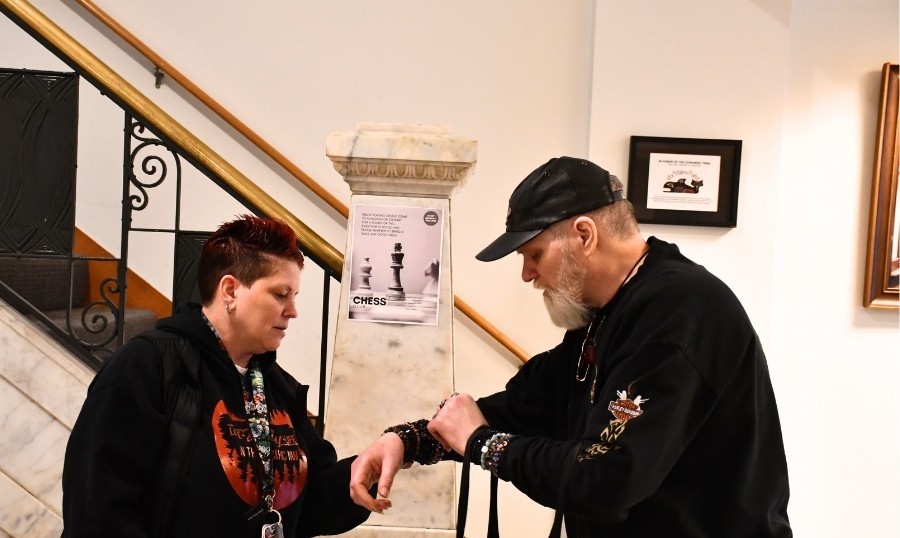 Shawn (right) sharing handmade jewelry with staff